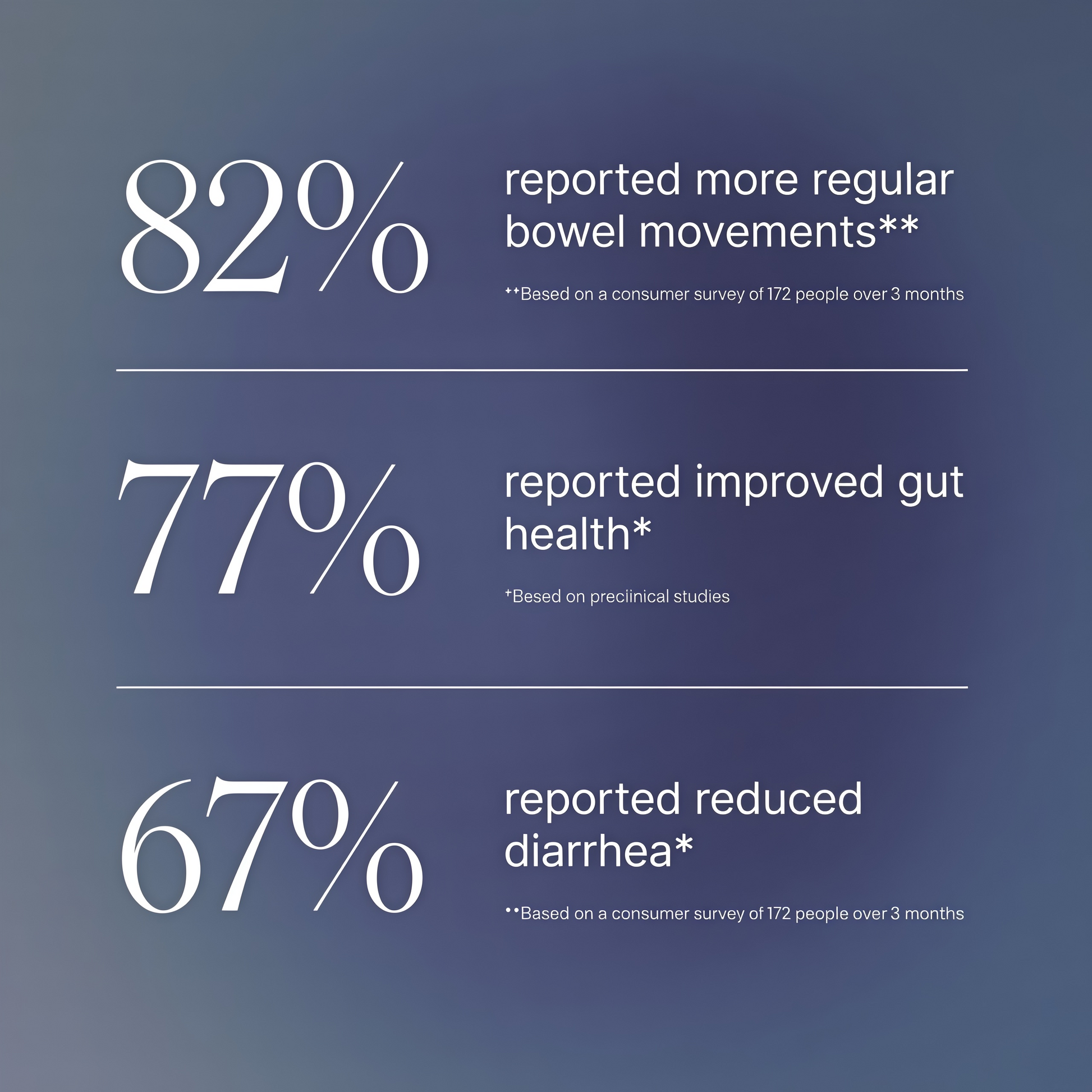 What consumer surveys have been done on Akkermansia?In a consumer study of 172 people taking Akkermansia over 12 weeks of product use, 82% reported improved bowel movements, 77% reported improved GI/gut health, 71% reported reduced occasional gas & bloating, and 67% reported reduced diarrhea. In a separate consumer study of 86 people taking Akkermansia for 3 months, 91% reported reduced overall food cravings and 86% reported reduced sugar cravings.